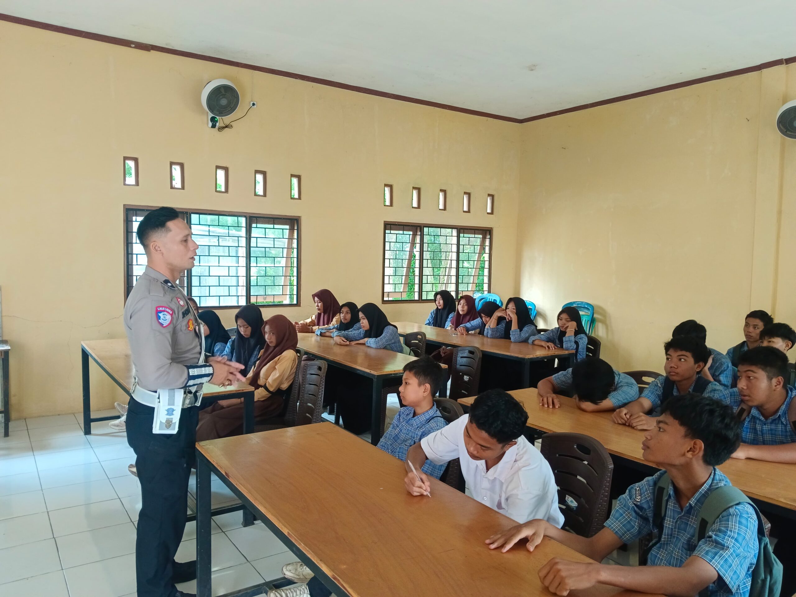Aipda Putu Jhoni selaku Kanit Kamsel Lantas berikan edukasi para murid sekolah SMPN 2 Gangga dalam upaya memberikan pemahaman akan pentingnya tata tertib berlalu lintas untuk keselamatan diri maupun orang lain untuk membentuk budaya tertib berlalulintas mulai dari sekolah.